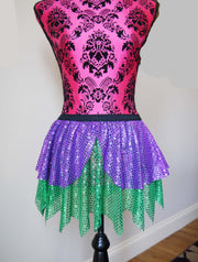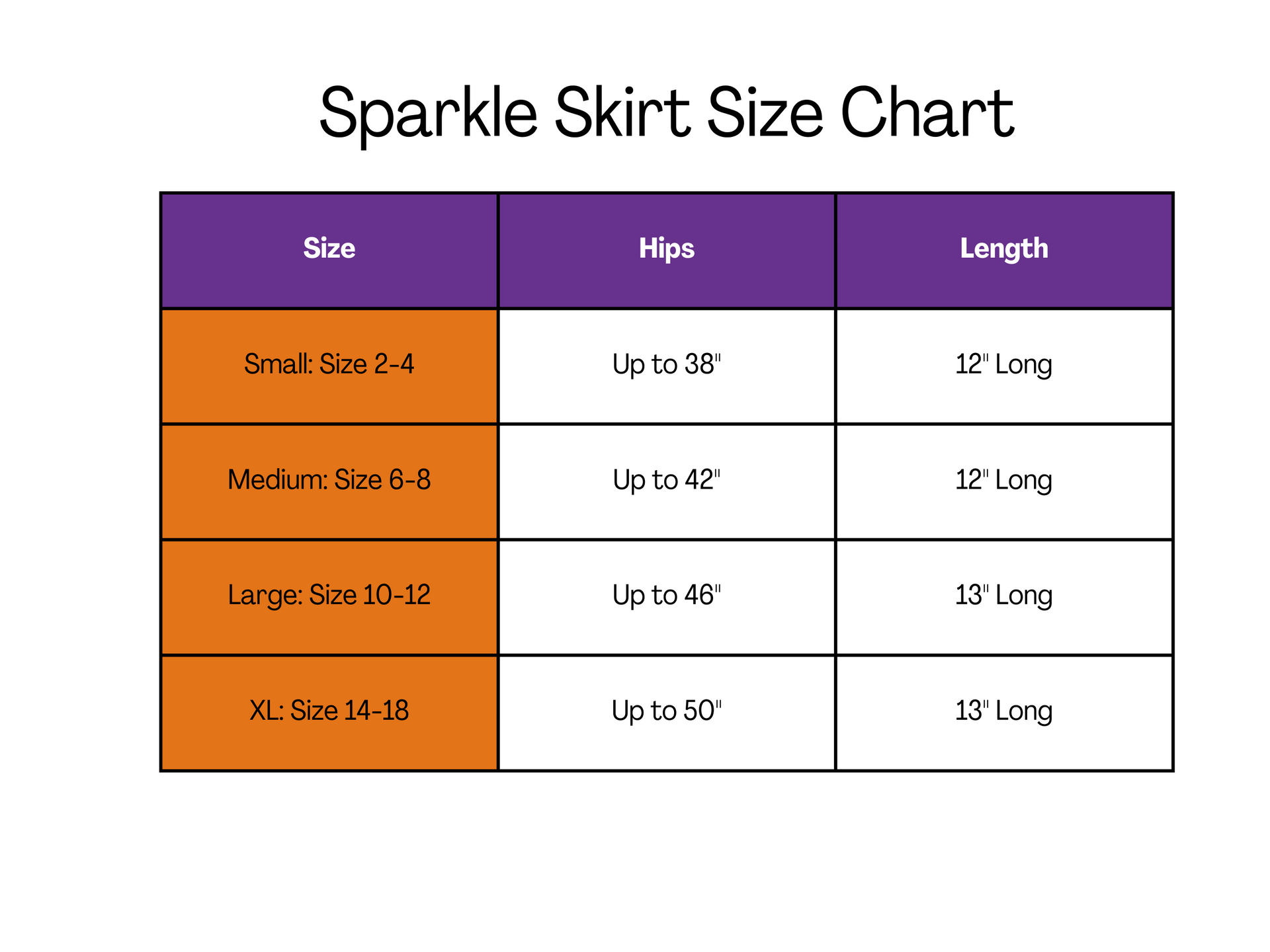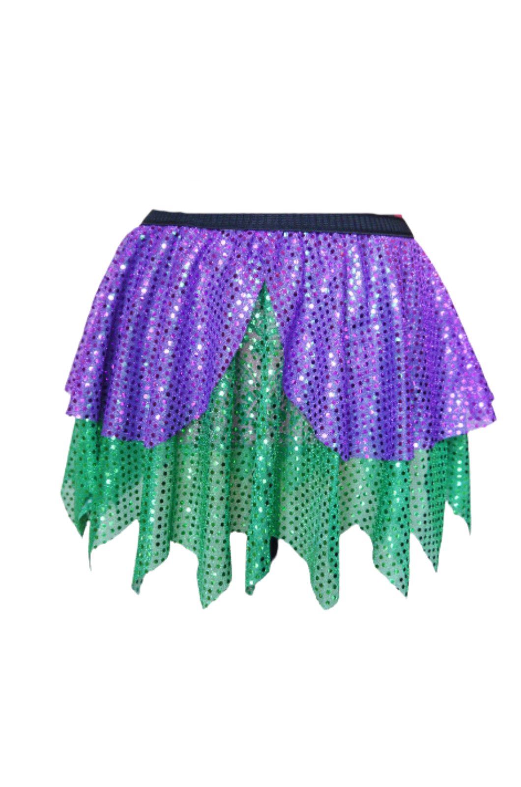 Skirt is meant to rest on hips and be wore over your favorite pair of running capris, shorts or leggings. The skirt features a purple sparkle top on a green sparkle skirt, 3/4" non-rolled elastic waist band and all the shine you can handle!